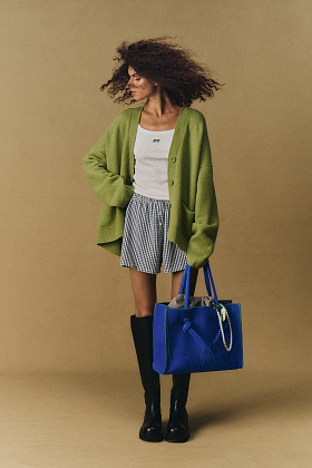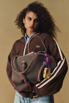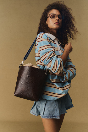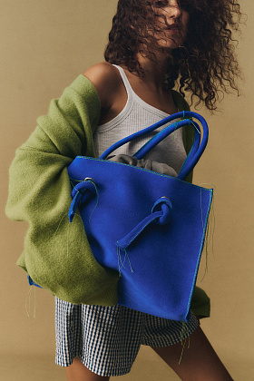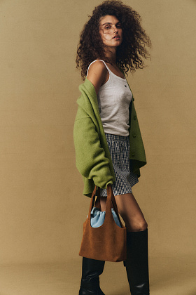 Raw Bag из замши с небрежной контрастной ниткой в цветах Gray и Electric, вдохновленная гранж-эстетикой; сумка Snake Choco с тиснением под змею; шопперы Suede и Half Bag из замши в цветах Rusty и Heaven.