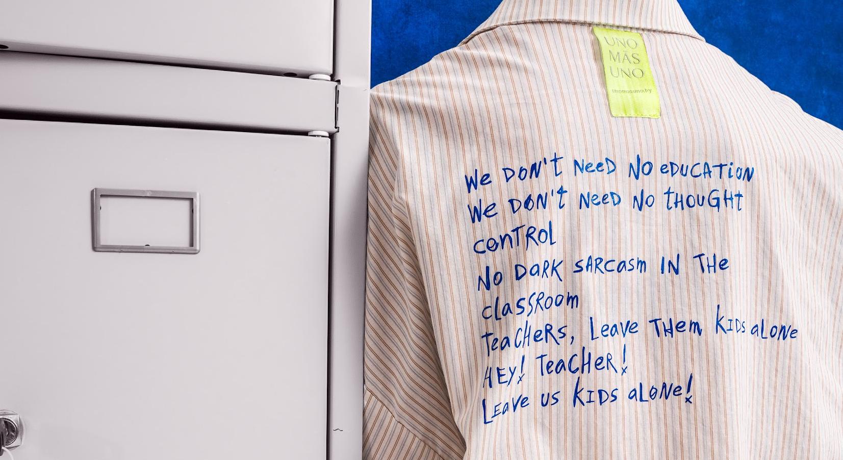 У бренда UNO MAS UNO из Беларуси вышла новая коллекция SCHOOL DROP, вдохновением стала школьная тематика. В дропе представлены рубашка из тайвека (с эффектом мятой бумаги), классический костюм цвета школьной доски, платье с воланами – отсылка к школьной форме СССР, блузка в горох со сменным поясом, спортивный костюм и футболка, которые меняют цвет от температуры, рубашка с цитатой из той самой песни Pink Floyd и лонгслив с реалистичным принтом дыма.